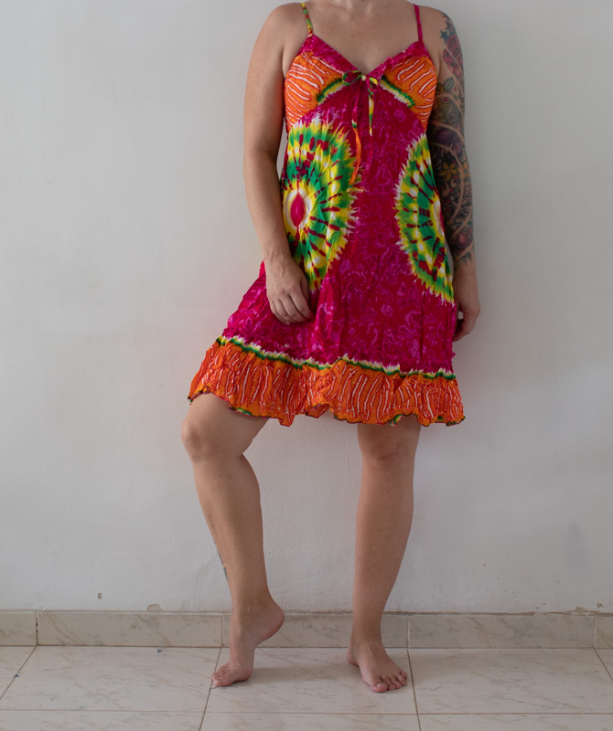 Vestido traido de Tailandia, corto sin mangas y con detalle estilo copas que realzan el busto